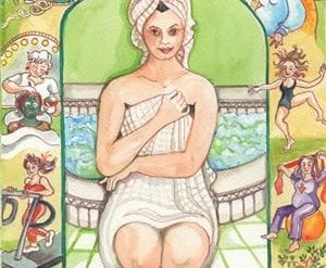 A woman emerges from a shell on the beach. Caught up in the bliss of becoming, she spreads her arms...